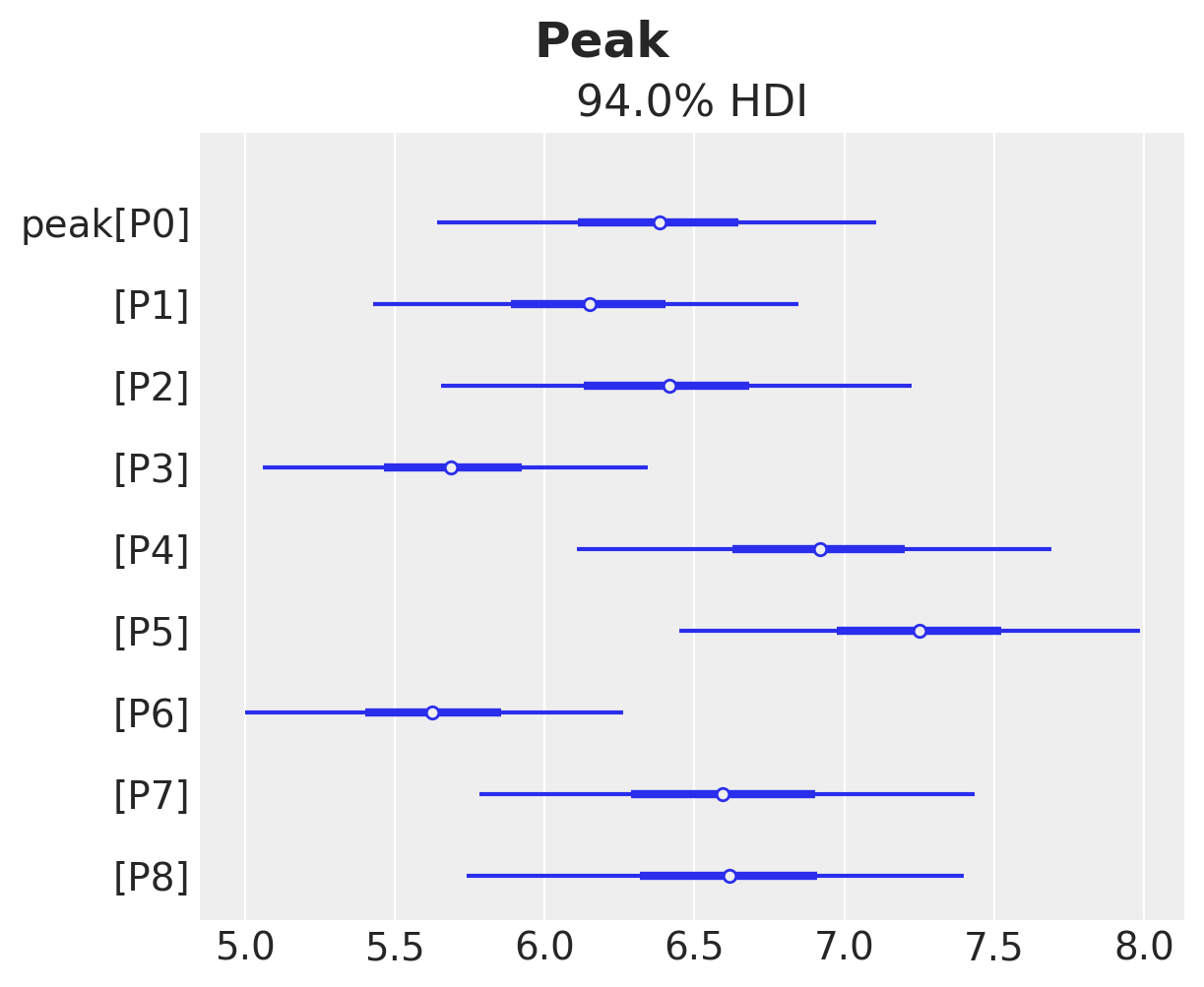 ax, *_ = az.plot_forest(idata["posterior"]["peak"], combined=True)