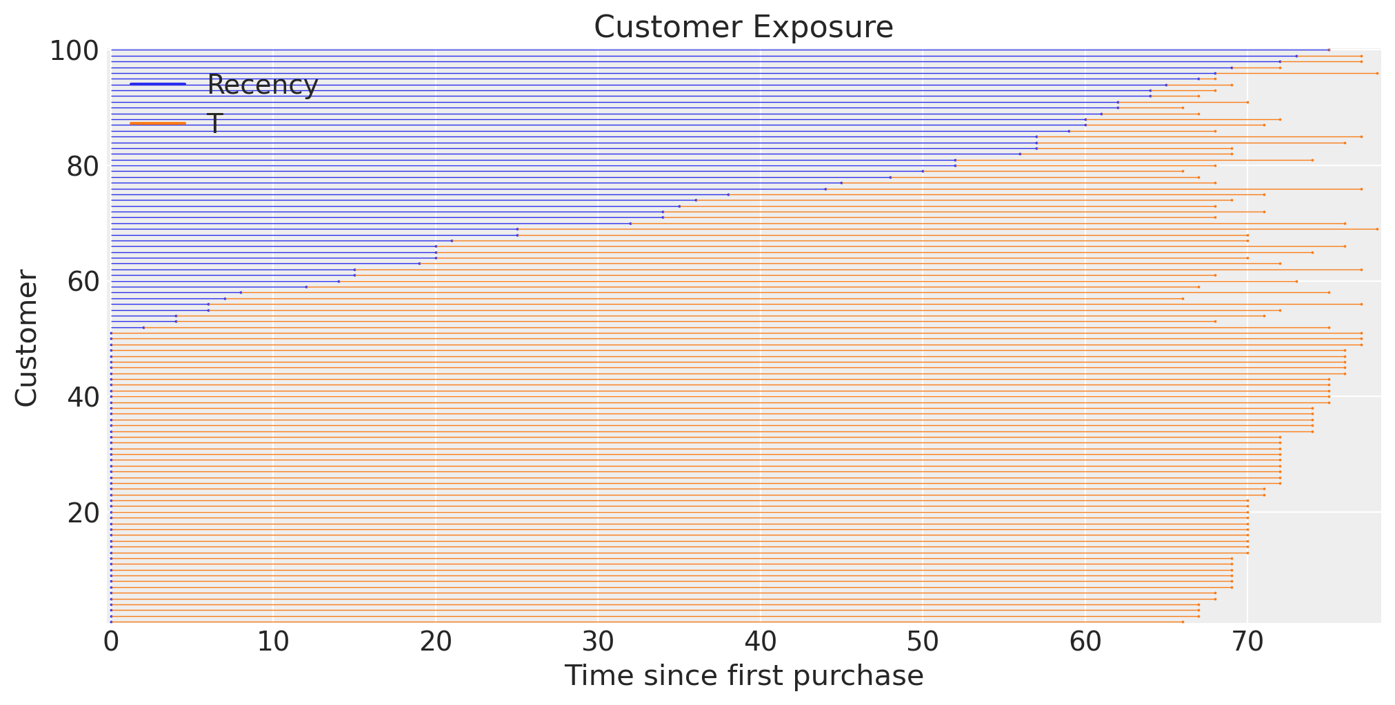 To visualize data in RFM format, we can plot the recency and T of the customers with the plot_customer_exposure