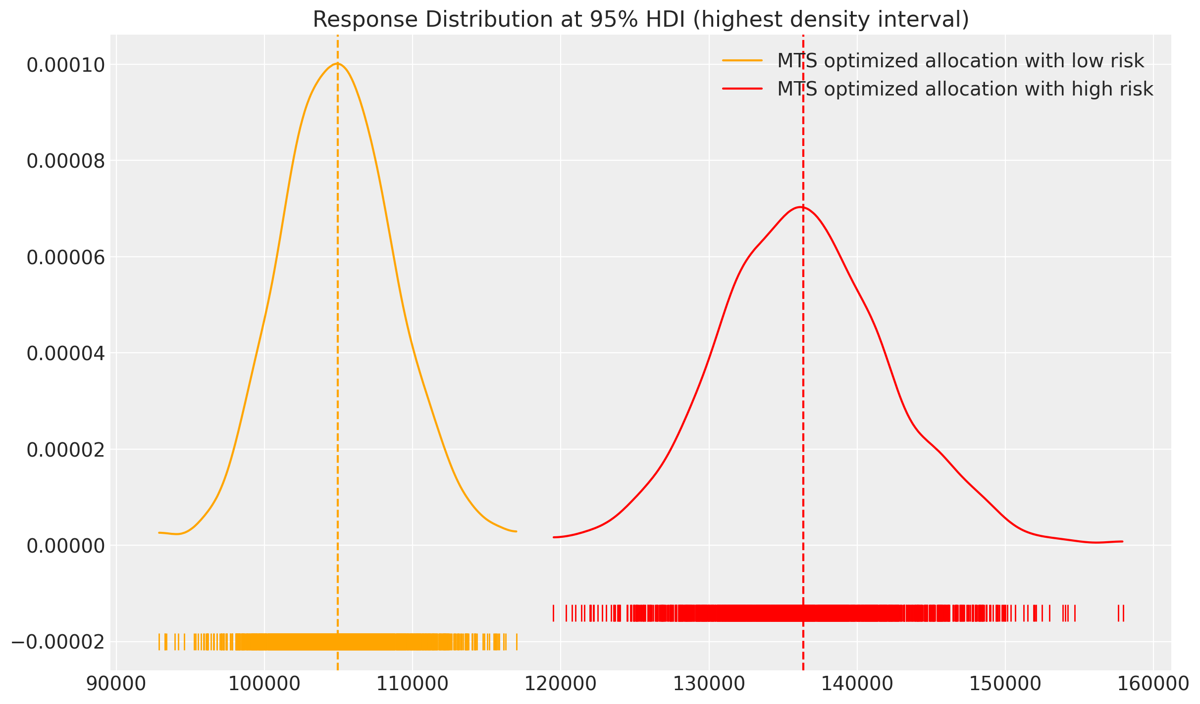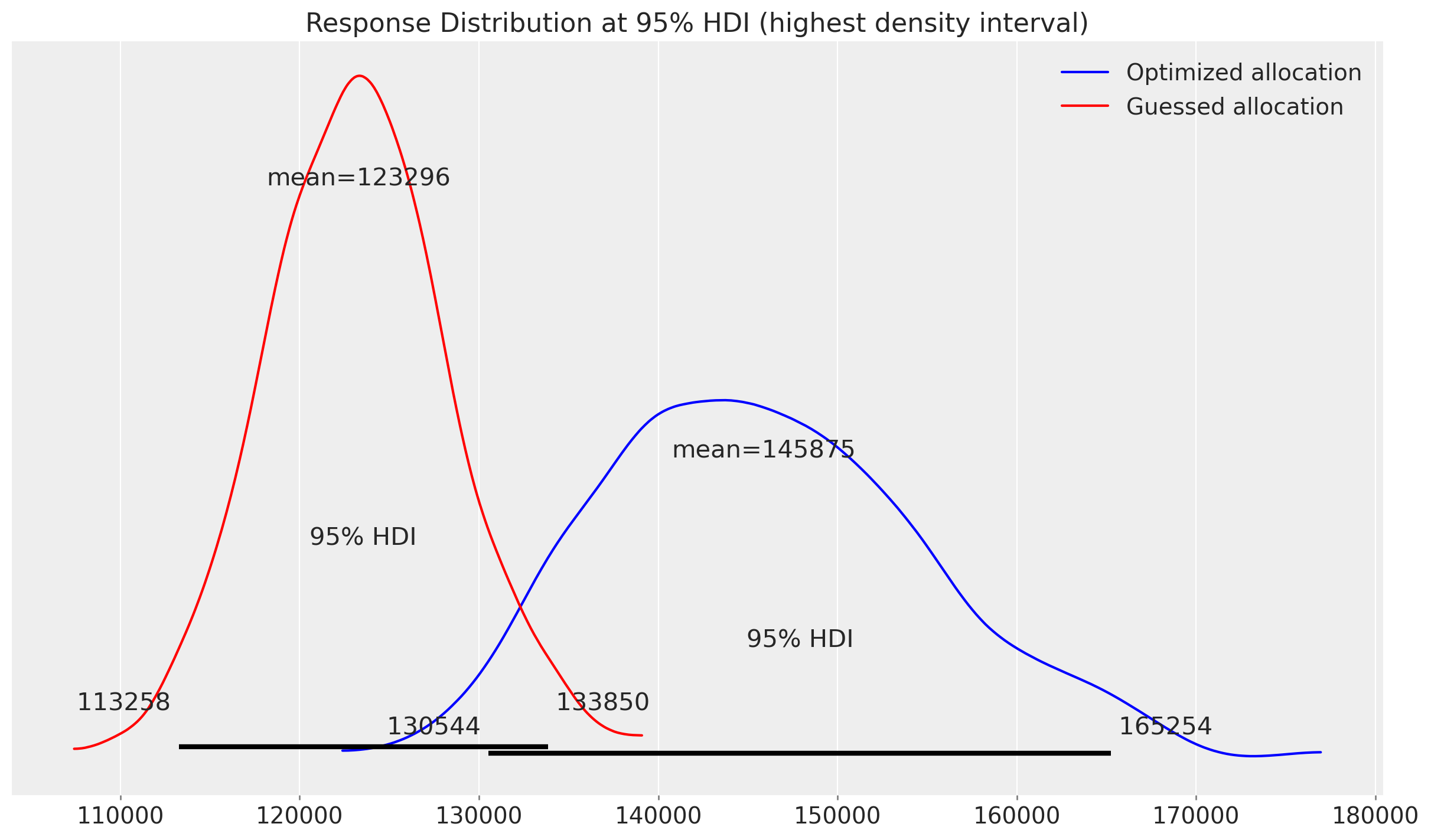 The optimizer is once again allocating the budget to \(X1\) majority, nevertheless \(X2\) it’s getting more money this time. However, this decision is informed by the expectation that the current combination will yield a higher Return on Advertising Spend (ROAS), while also presenting a small lower risk profile compared to the previous allocation.