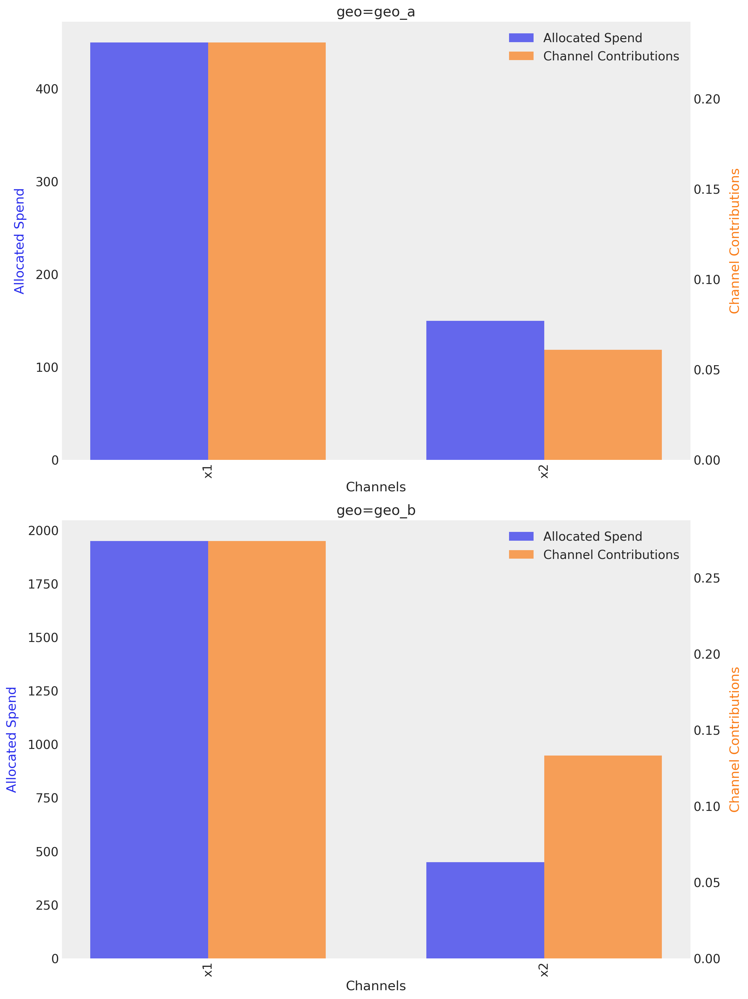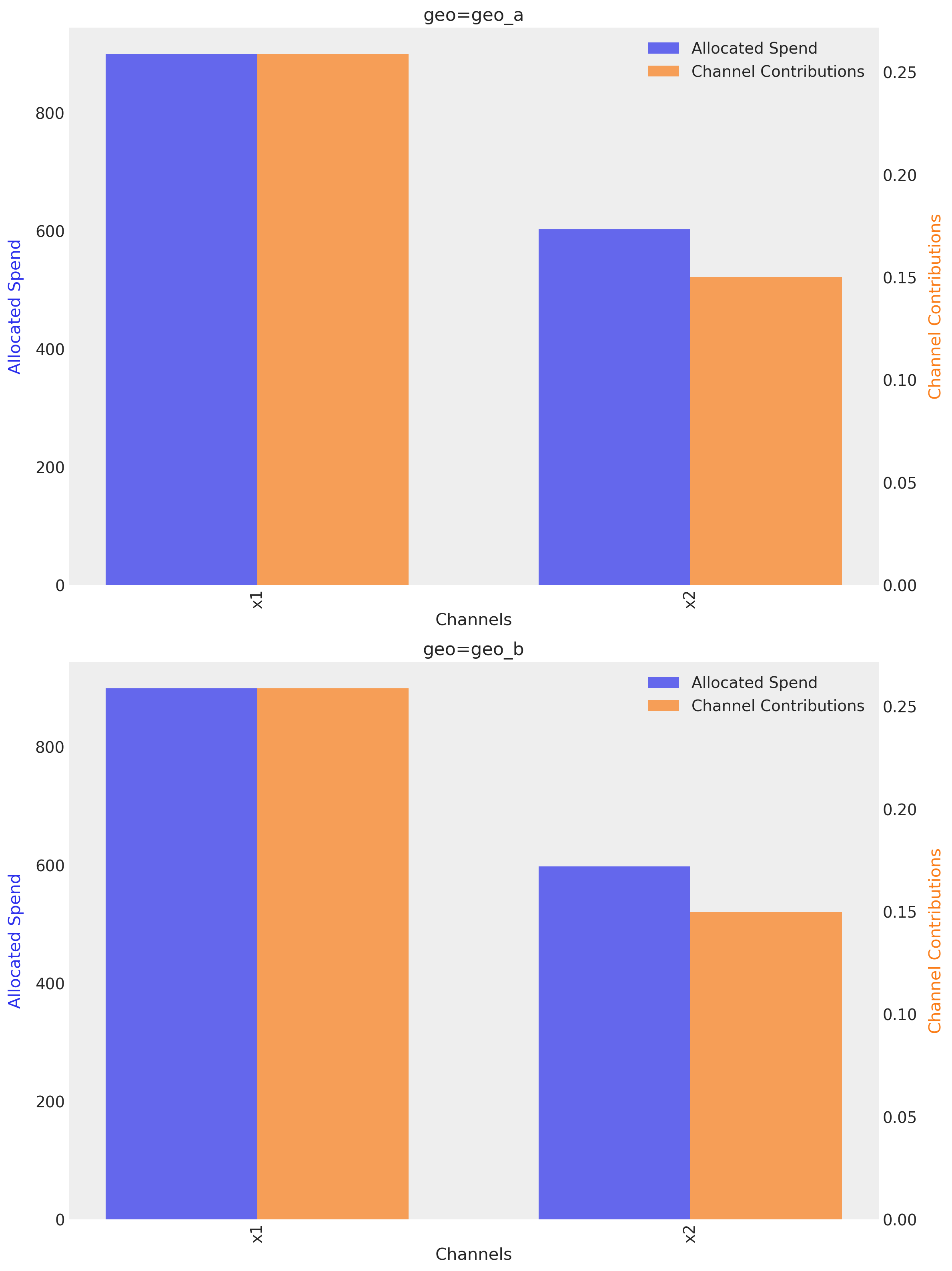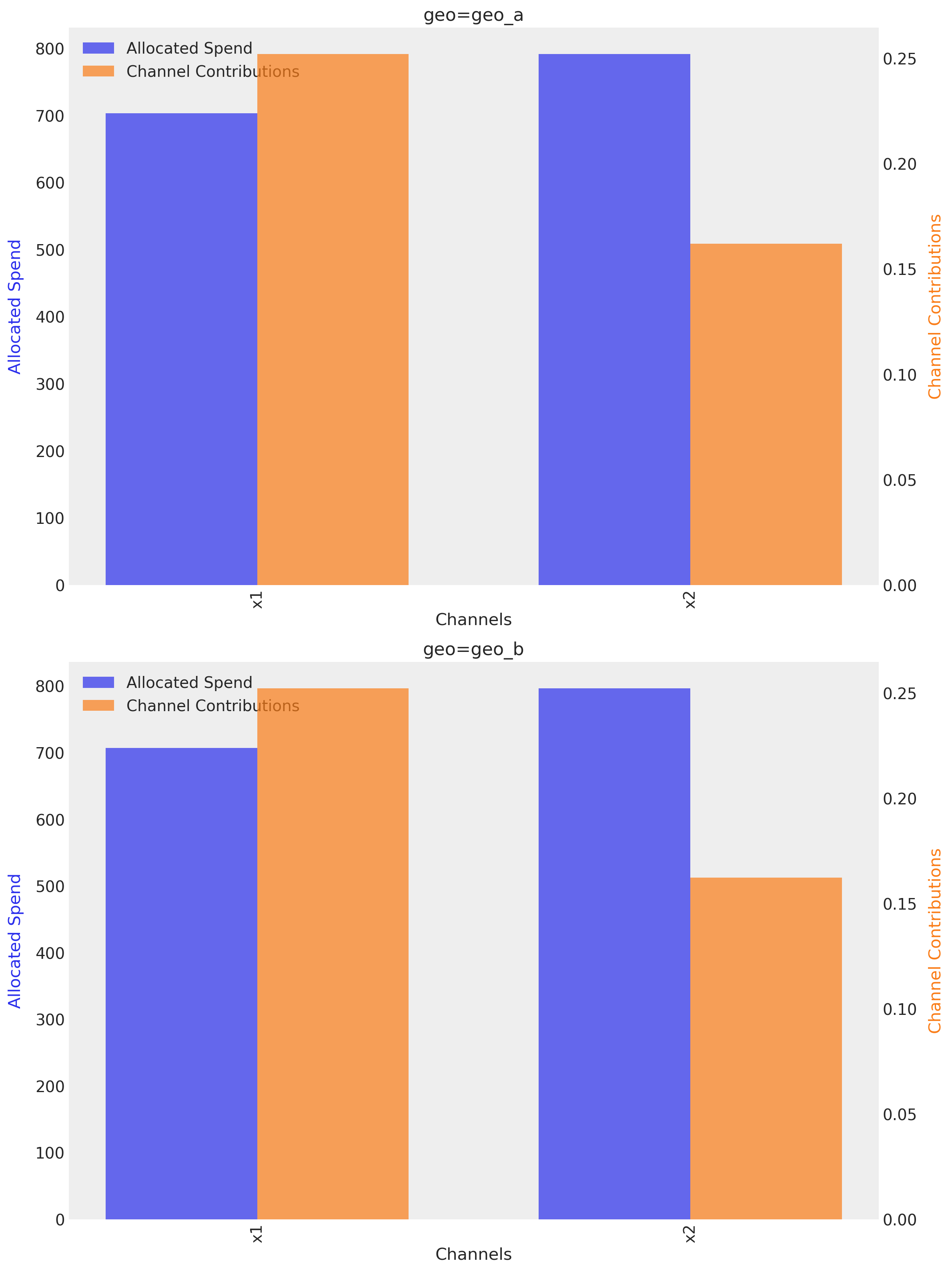 We can see that the optimizer is allocating the budget more evenly between the two channels (\(X1\) and \(X2\)), they are spending almost the same amount. This allocation is more balanced than the previous ones. Nevertheless, the total allocated budget is more balanced, the risk is higher, in response terms.