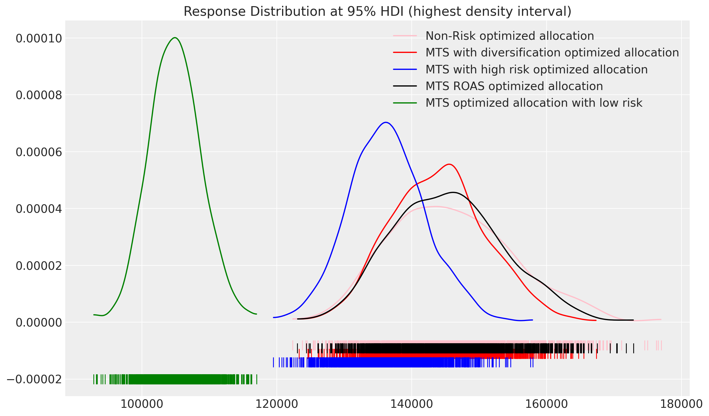 Value at Risk is a statistical method employed to quantify the risk of financial loss within a portfolio or investment. Within the realm of marketing, it assists in understanding the potential worst-case loss (ROAS) associated with a particular budget allocation, evaluated at a specified HDI (highest density interval). By minimizing VaR, we aim to select an allocation that ensures, even in adverse scenarios, the ROAS remains as elevated as feasibly possible.